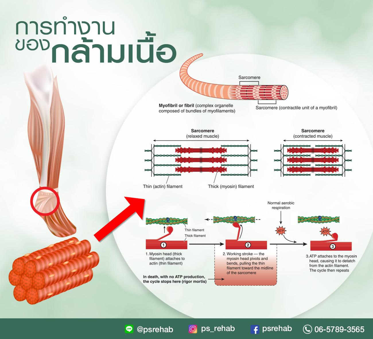 ทำให้กล้ามเนื้อหดสั้นลง และเกิดการเคลื่อนไหวขึ้น เมื่อกล้ามเนื้อคลายตัว เส้นใยเหล่านี้ก็จะหลุดออกจากกัน