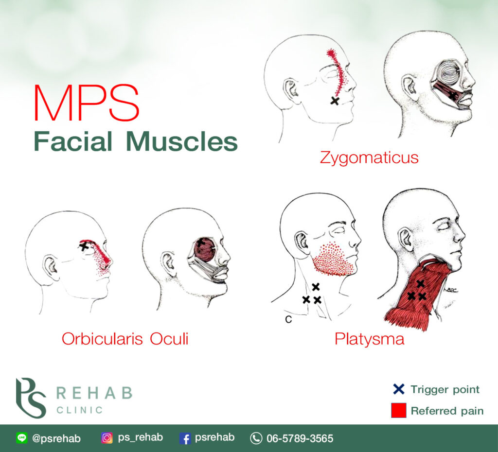 – Platysma ดึงผิวหนังบริเวณคอ และดึงมุมปากลง หากเกิด Trigger point จะมีอาการปวดแสบบริเวณขากรรไกรล่าง