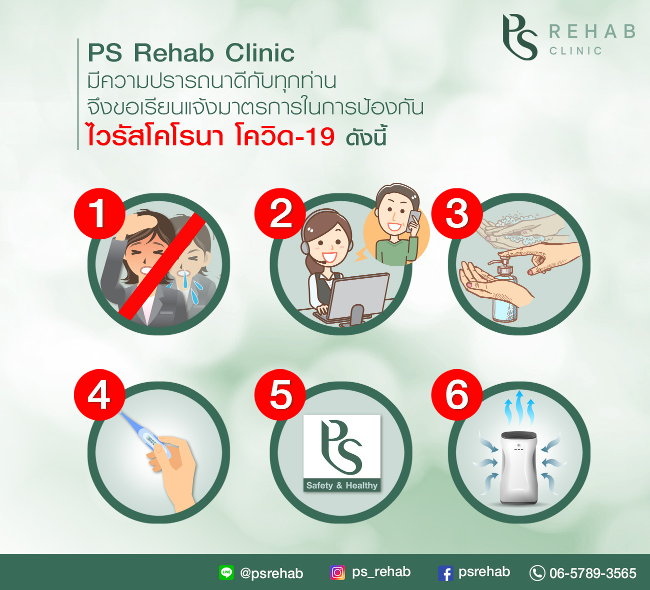 PS Rehab Clinic มีความปรารถนาดีกับทุกท่าน จึงขอเรียนแจ้งมาตรการในการป้องกันไวรัสโคโรนา โควิด-19 ดังนี้