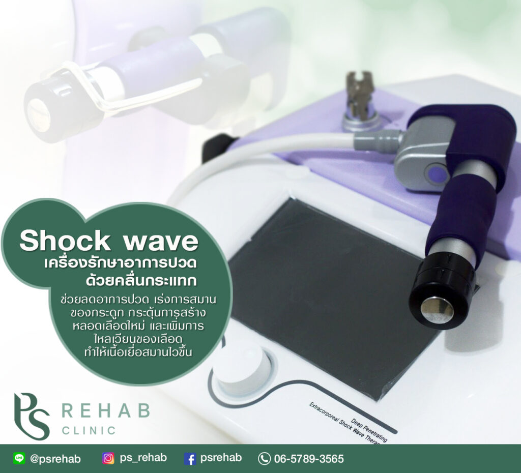 เป็นการใช้คลื่นเสียงไปกระตุ้นบริเวณที่มีอาการปวดหรือบาดเจ็บเรื้อรังเพื่อทำให้เลือดหมุนเวียนในบริเวณดังกล่าวมากขึ้น ลดการอักเสบ และทำให้เกิดกระบวนการซ่อมแซมและฟื้นฟู ร่างกายสร้างเนื้อเยื่อใหม่ (Re-Healing) การรักษาโดยเครื่อง Shock Wave ใช้ระยะเวลาประมาณ 5 นาที ภายหลังการรักษาคนไข้สามารถกลับไปทำกิจกรรมหรือไปทำงานได้ตามปกติ